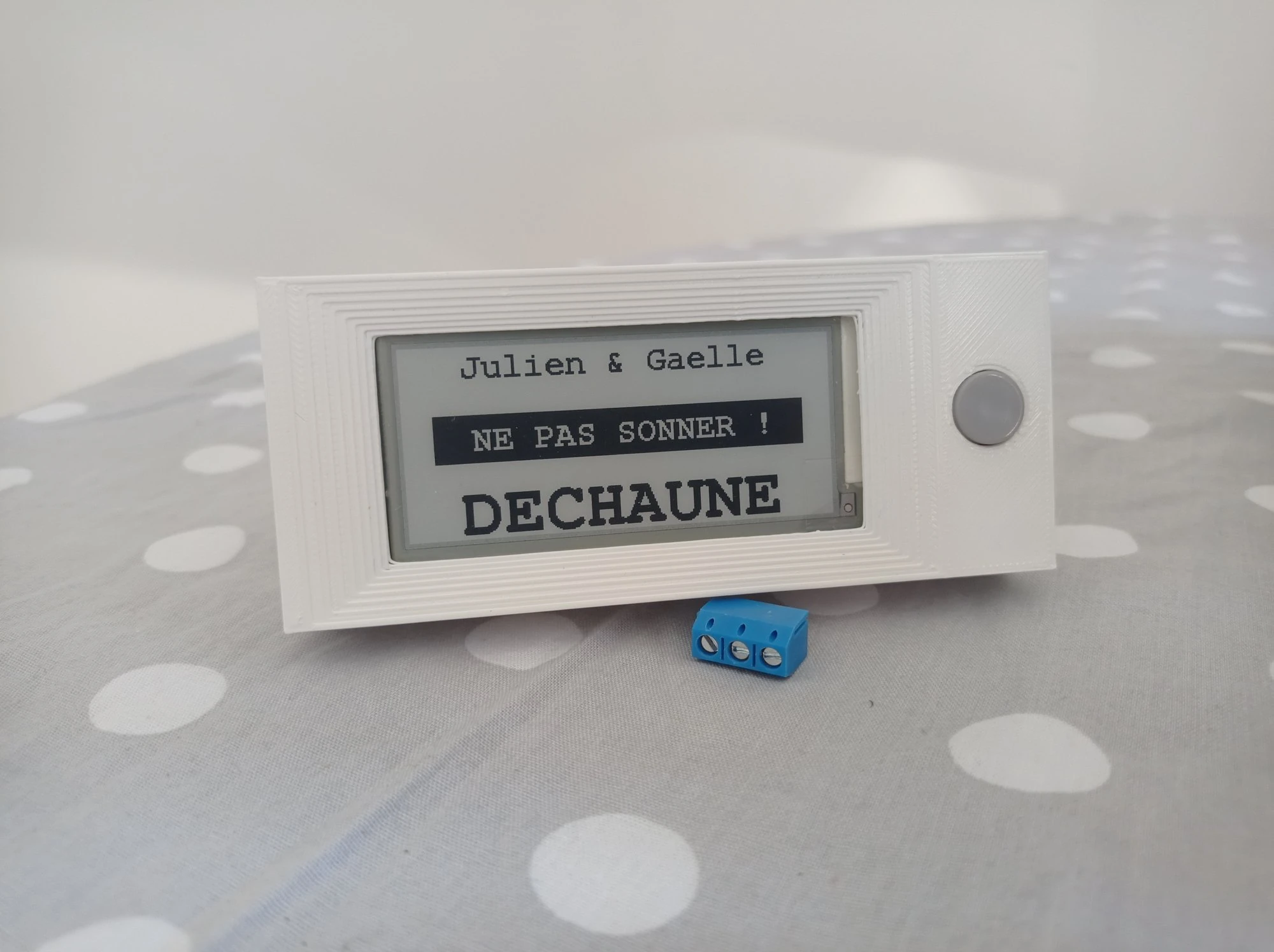 Un vrai geek doit être connecté jusqu'à la sonnette. J'ai donc conçu une sonnette connectée communicante en MQTT. Elle permet d'afficher via un écran e-ink des messages spécifiques. Le mode "DND" permet de désactiver le carrillon et d'afficher un message sur l'écran indiquant de ne pas sonner.